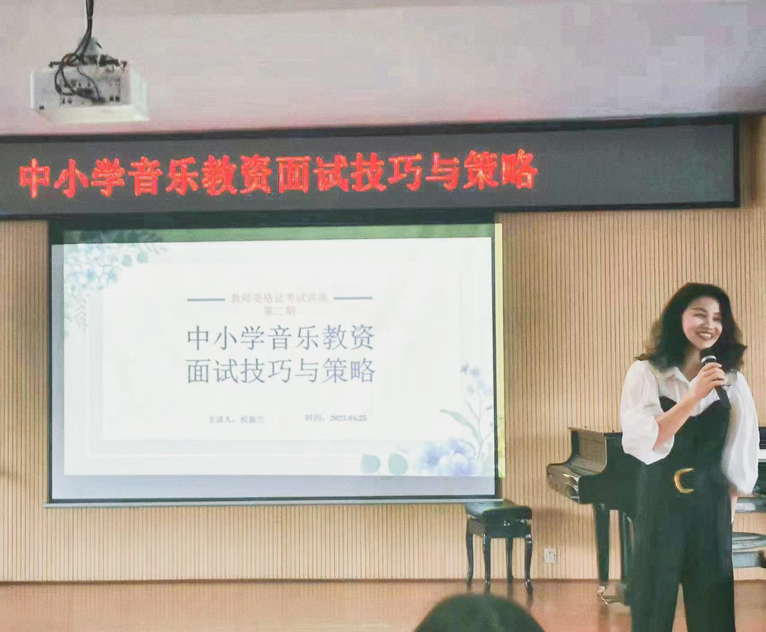 讲座上,侯老师对中小学音乐教资面试进行了深入地解构性讲解,为同学们明晰了结构化面试与标准化面试考核的要点。首先,她为同学们对面试这一板块展开了具体阐述,从结构化特点、面试场景、考核流程、三个必考内容等环节向同学们介绍了教资面试应具备的学业要求,重点强调了规定问题解答、高中音乐课程六大教学模块备课方法、试讲环节的技巧和教学设计策略,并邀请同学们参与到试讲环节的演示活动,为同学们开展了一堂生动有趣的教资面试讲座课。