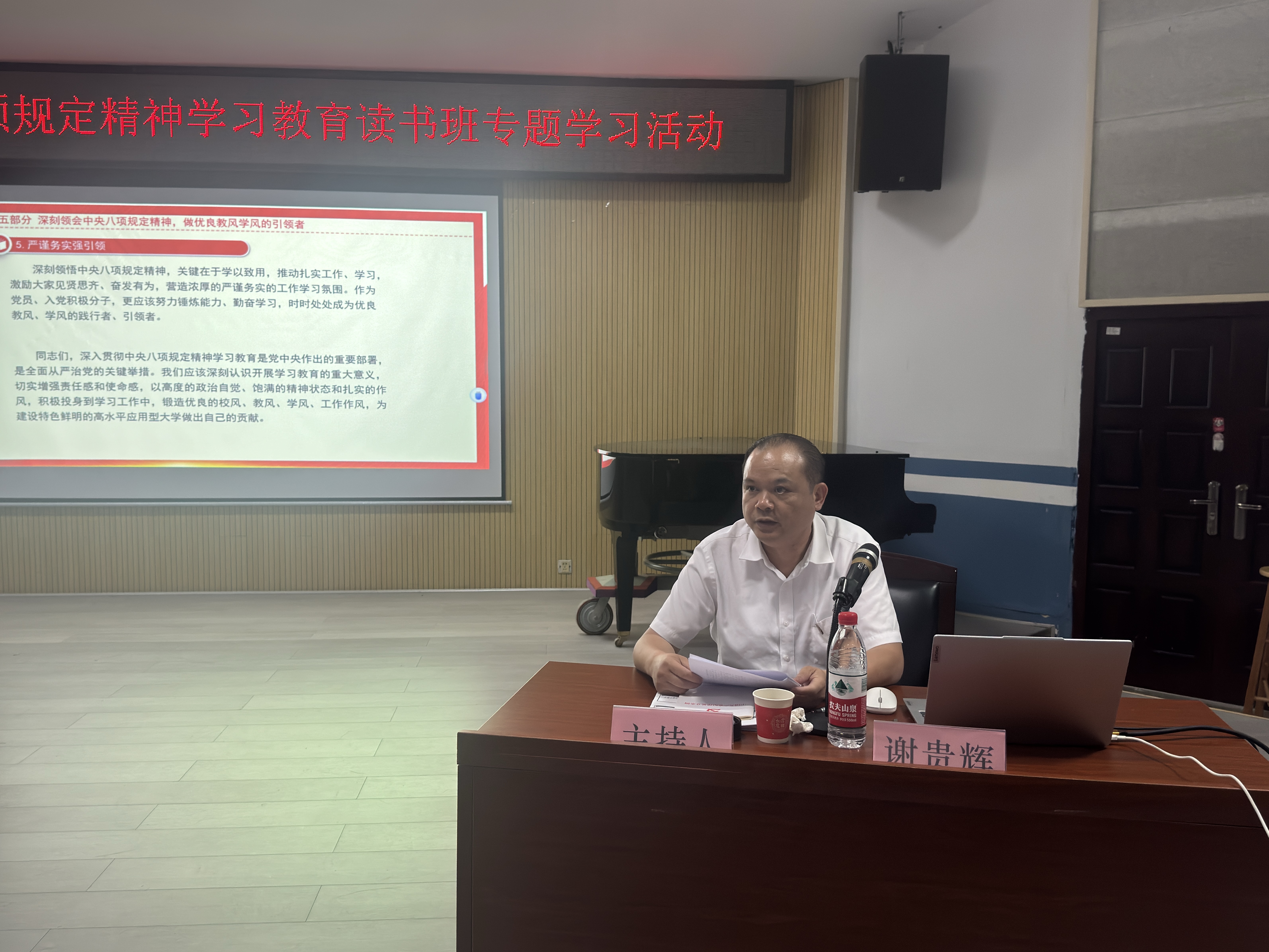 为深入贯彻中央八项规定精神,强化党员干部作风建设,2025年6月11日晚,公司组织开展“深入贯彻中央八项规定精神学习教育读书班专题学习活动”。本次活动由mksport体育纪委书记谢贵辉主讲,公司党委书记刘隆华主持,公司领导班子、教师党员、员工党员及入党积极分子参加,在学思践悟中筑牢作风建设根基。