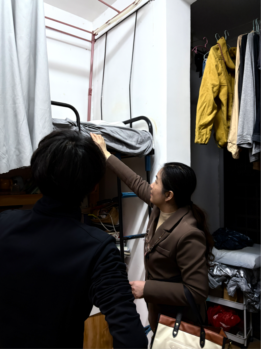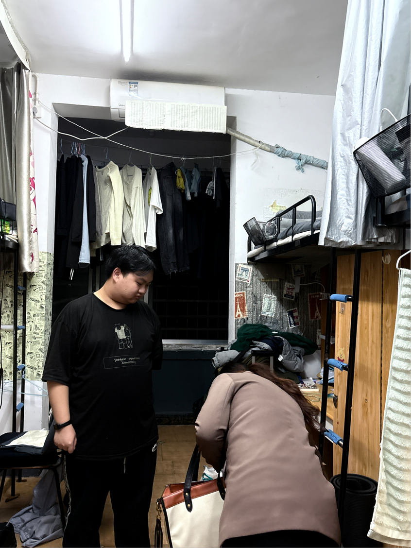 老师和同学们主要围绕前段时间宿舍存在的违规电器、校外租房、宿舍卫生、饲养宠物等问题进行检查,同时向2022级等重点寝室再次强调违规用电、晚归及校外租房等行为危害严重,要求各班各寝室全面排查隐患,确保宿舍安全,营造优良校园环境。