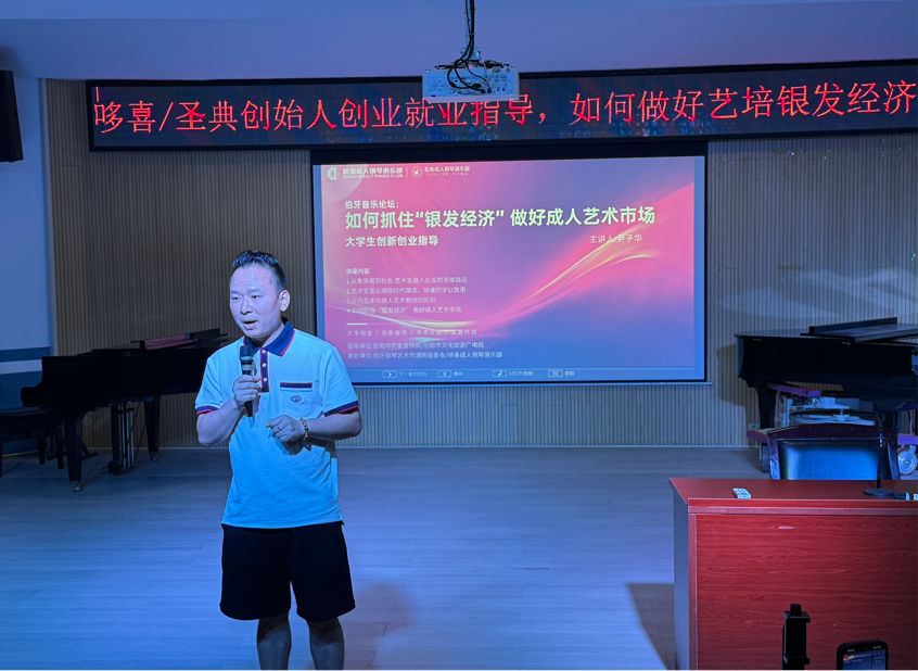 本次讲座特邀哆喜成人钢琴俱乐部、北京圣典成人钢琴俱乐部创始人尹子华先生担任主讲。作为成人钢琴艺术交流领域的资深从业者,尹子华围绕艺术生职业发展与钢琴教育创新展开系统分享,涵盖四大核心内容:解析艺术生融入社会的多元路径,助力校园到职场的平滑过渡;探讨艺术生如何把握时代脉搏,实现知识向实践的高效转化;对比少儿与成人钢琴学习特点,为分众化钢琴教育提供理论支撑;分享成人艺术市场运营策略,为行业从业者提供实战指导。