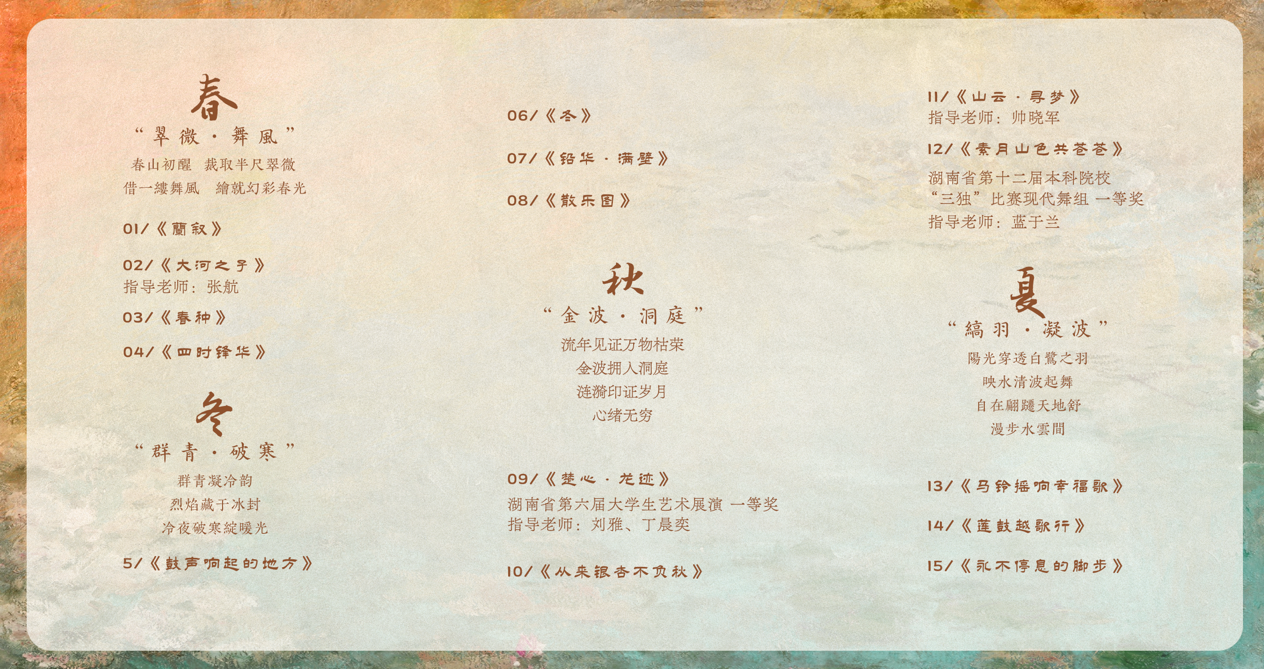 本场演出分为“春”“冬”“秋”“夏”四个篇章,涵盖中国民族民间舞、中国古典舞、现代舞三种舞种,以多元艺术形式展现舞蹈魅力。开场古典舞《蘭叙》如水墨长卷舒展,以行云流水的肢体语言诠释东方美学的深邃意境,拉开晚会序幕。男生剧目《大河之子》气势磅礴,演绎黄河文化深厚底蕴。《春种》以欢快舒展舞姿点燃观众热情,维吾尔族舞蹈《鼓声响起的地方》充满异域风情,朝鲜舞《冬》展现外柔内刚的张力美学。古典舞《铅华·满壁》《散乐图》将气氛推向顶峰,诠释楚文化浪漫的《楚心·龙迹》与现代舞《素月山色共苍苍》令人眼前一亮。最后晚会在群舞《永不停息的脚步》中圆满落幕,现场掌声如潮,热烈的氛围此起彼伏,为舞者们的精彩演绎献上最诚挚的喝彩。