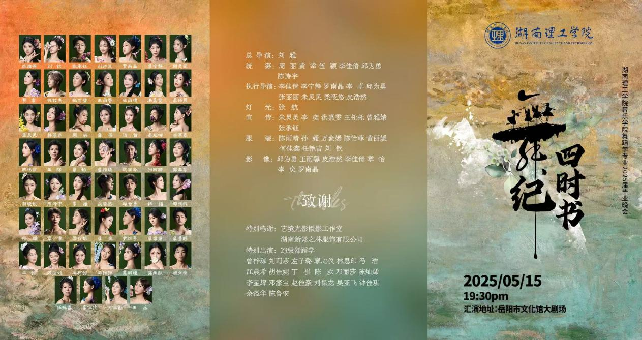 当四季韵律与青春脉搏同频,春樱下舒展,夏雨里淬炼,秋枫间腾跃,冬雪中坚守,舞出毕业季的华彩终章。5月15日19:30,MK体育2021级舞蹈学专业毕业专场晚会“舞纪·四时书”在岳阳市文化艺术会展中心隆重举行。校领导谢贵辉,MK体育的领导、师生及部分社会人士共同观看了这场精彩演出。