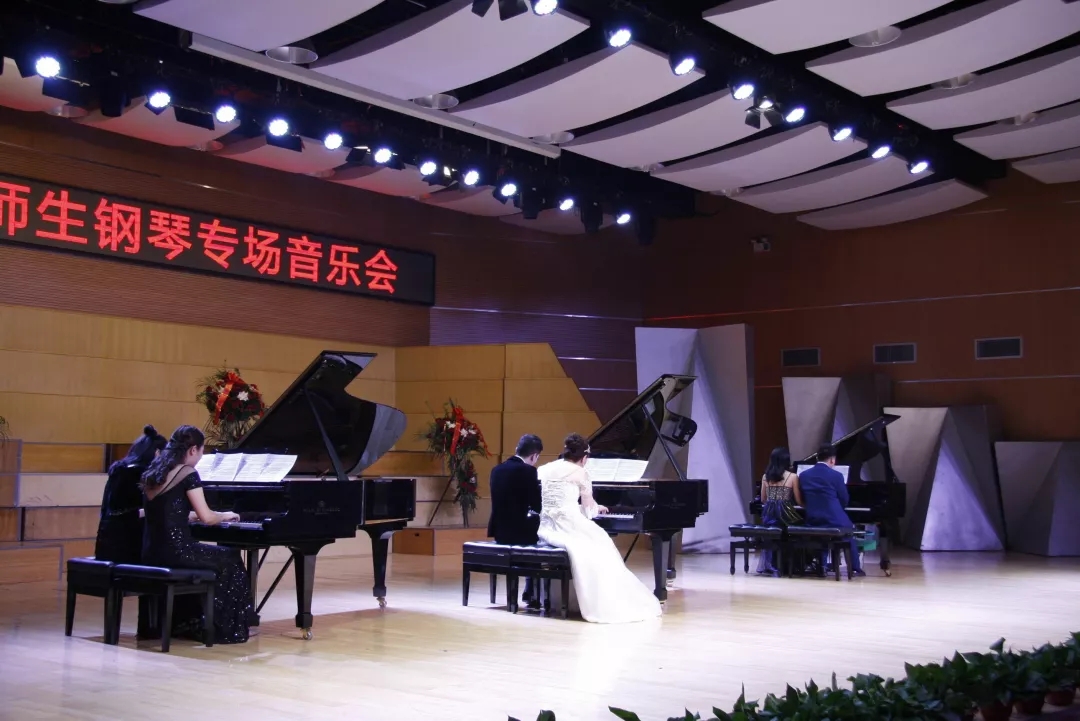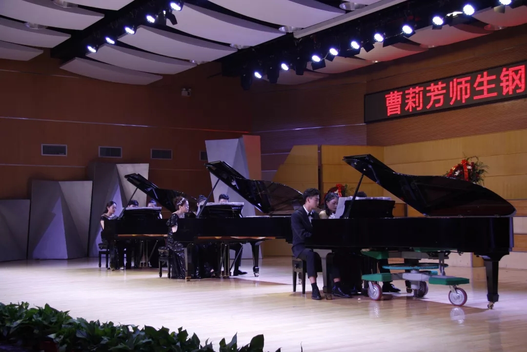 今晚曹老师和她的员工们用手指带领我们聆听美妙的音乐,感受钢琴如水旋律。钢琴十八手联弹《钟》拉开了音乐会的帷幕。