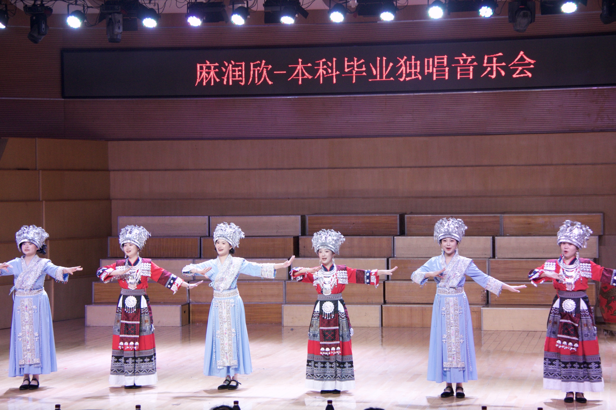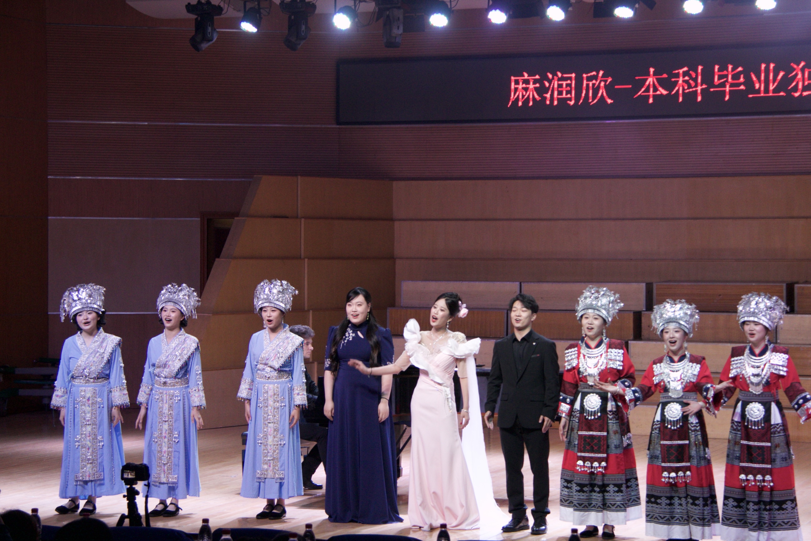 特邀嘉宾吴馨月与麻润欣共同演绎了歌曲《梨花又开放》,歌声中饱含对故乡的眷恋与对生命的深刻感悟。随后,麻润欣独唱了根据苏轼词作谱写的艺术歌曲《定风波》,其演绎生动展现了古代文人的气度与风骨。音乐会还呈现了由麻润欣的学妹——童兰玉、刘心怡、吴馨月、陈嘉凌、陈树英、周梦园带来的女声合唱《云中恋歌》,她们以清澈甜美的嗓音,诠释了苗族少女对美好爱情的纯真。