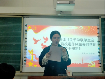 团学分会执行主席简丽娟带领大家学习了《省学联下发的学习资料》并和大家分享了自己在学习上的经验,员工副书记彭俊雄、执行主席徐永畅、员工副书记张茜分别对员工干部作风建设问题警示教育做案例解读、宣读了《关于学联员工会工作人员改进工作作风服务同学的若干规定》和《我为青年做实事活动倡议书》。