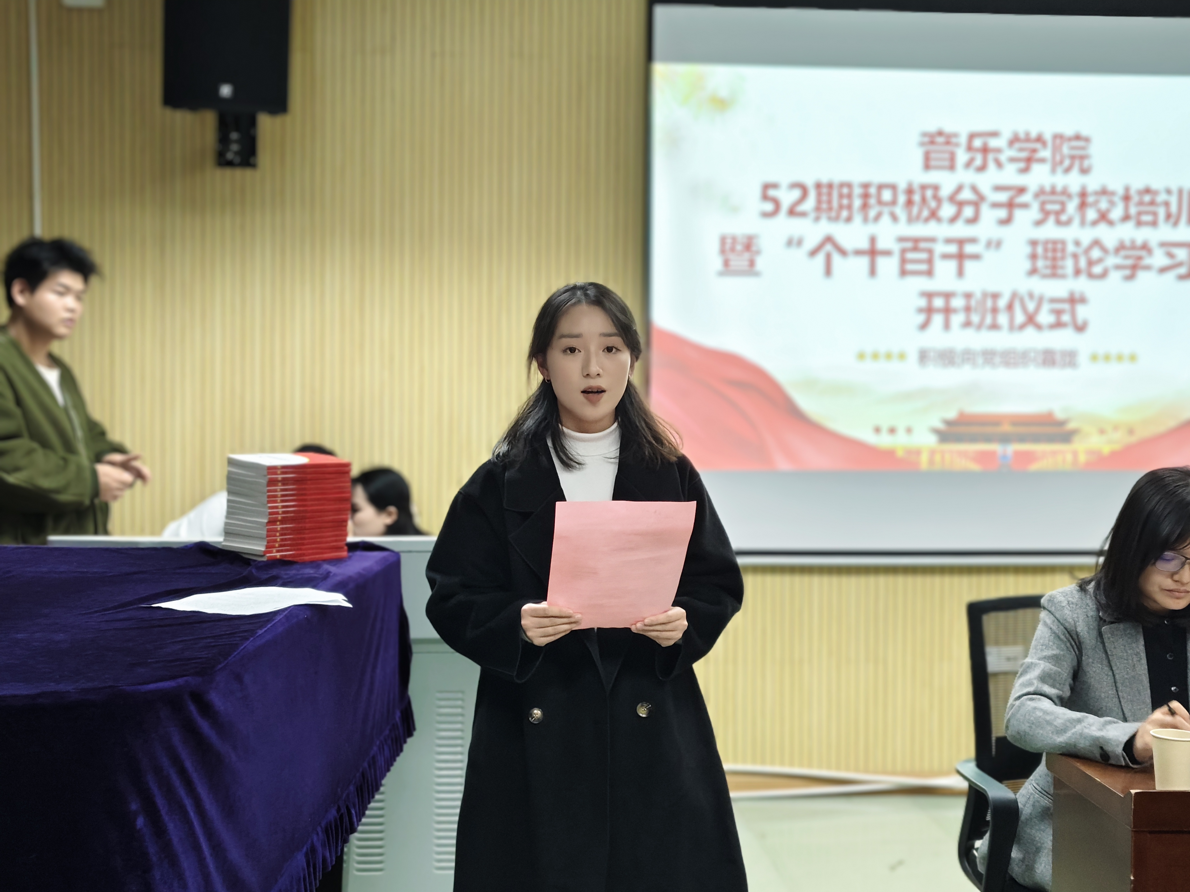 开班仪式在庄严的国歌声中拉开序幕,全体人员起立,奏唱国歌。随后,邵欢欢老师详细讲解了党校学习守则及相关规定。她强调,学员要认真做好笔记、积极参与小组合作,在学习中充分发挥先锋模范作用。此外,她还提到,党校将依据学员的学习态度和表现进行评优评先,鼓励大家认真学习。紧接着培训班学员代表周梦圆发言,她表达了全体学员积极向党组织靠拢的决心,表示将以崭新的姿态、饱满的热情投入到党课学习中,不断提升自我,争取早日成为一名合格的共产党员。