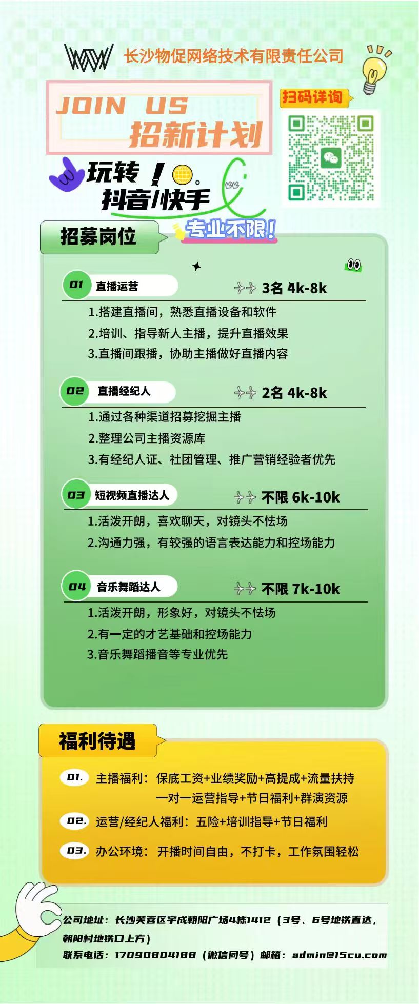 擅长沟通表达,性格开朗,责任感强,工作积极主动,具备学习意识主动性。抗压力强。编导专业优先、有直播运营或直播经验优先。 |