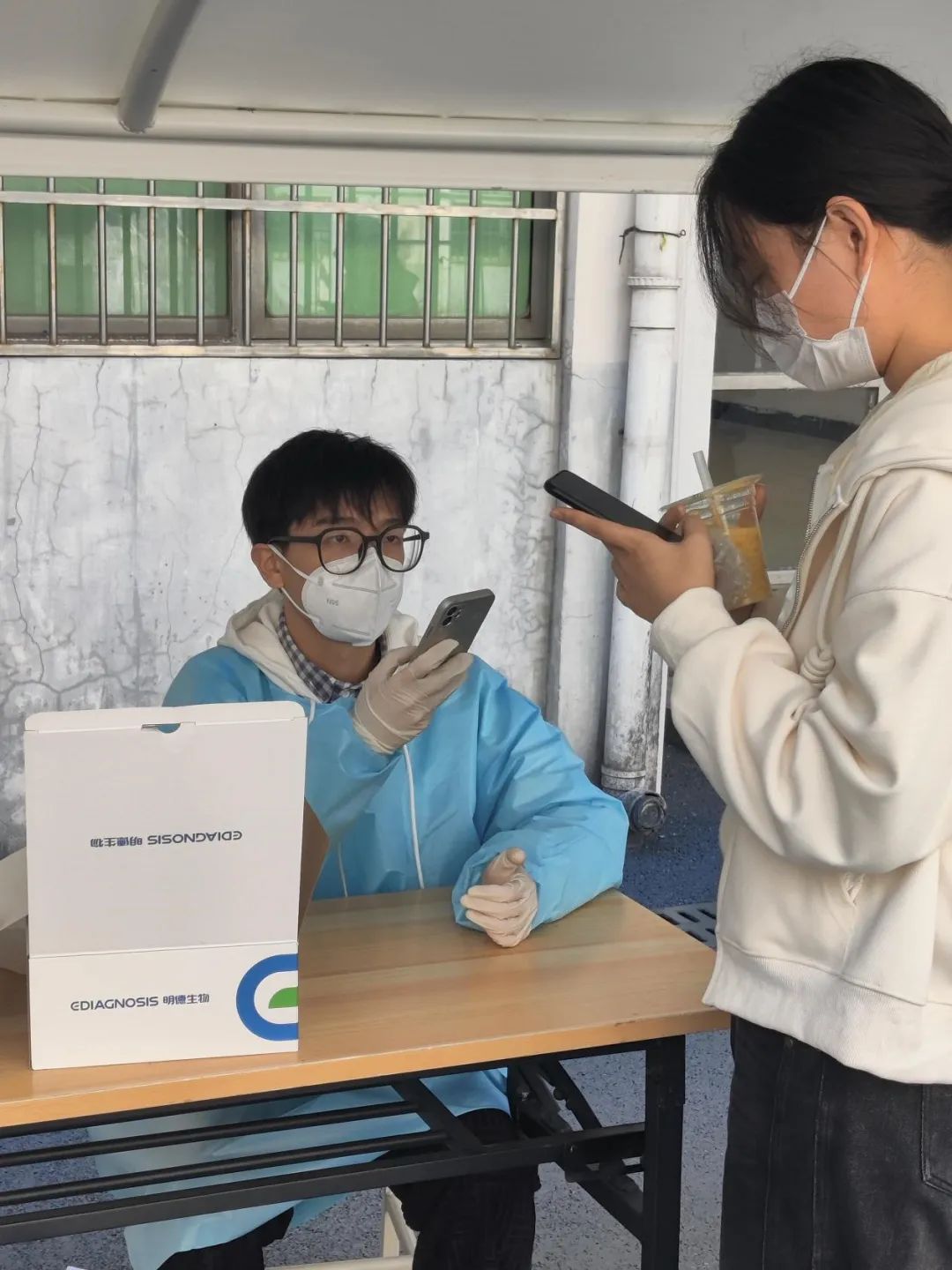 二号园区核酸检测点,他们用心留意每一个来做核酸的人,叮嘱戴好口罩,保持1米安全距离。