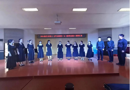 第一部分是两首中国作品,第一首选自由赵元任先生为他的两个女儿所创造的一首游戏作品,名叫《轮唱歌》,在游戏的过程中通过轮唱的技巧训练和和声的对位,同时大小调的转换在情绪上也有一些色彩的变化;第二首作品《雪花》,是刚刚结束的北京冬奥会的主题曲,由张帅作词曲。同学们精彩的演唱呈现了“浪漫空灵”,余音绕梁,给人以“三月不知肉味”的感觉,歌曲中,整片“大雪花”的光在一圈一圈地关闭,最后只留下中间的小火心,圣火渐渐熄灭。