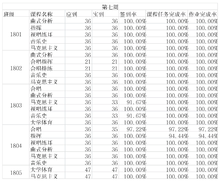 18级同学在第七周线上学习中数据较上周有了较好的提升部分班级已达到全100%希望同学们能够