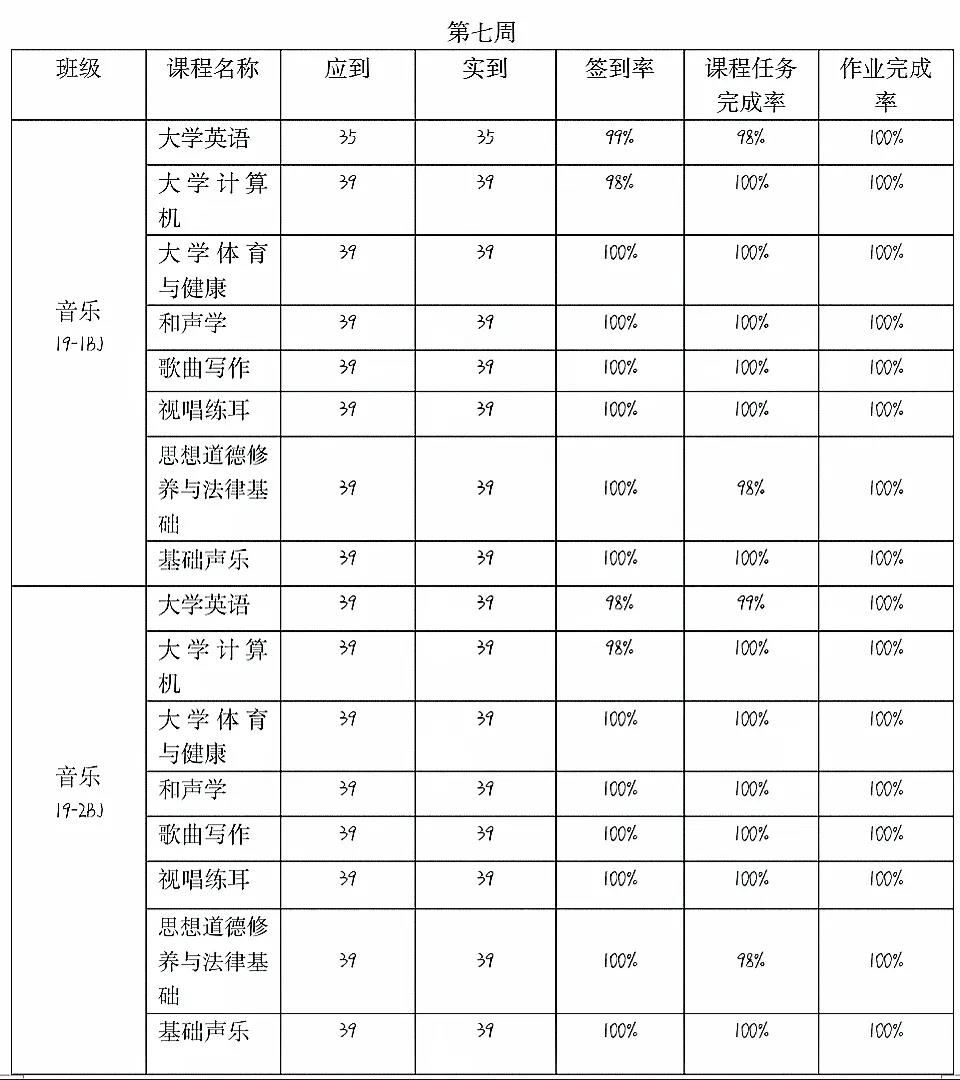 17级同学在第七周线上学习中基本保持了100%的数据但有小部分班级的签到率有所下降希望学长学姐们能够