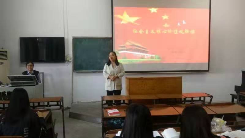 随后,郑凤梅重点讲述了党的十八大所提出的24字社会主义核心价值观,对社会主义核心价值观从国家层面,社会层面和个人层面逐一进行解读,阐述了其内涵,总结出社会主义核心价值观的意义。郑凤梅通过引用习近平总书记在北京大学的讲话勉励当代青年要自觉践行社会主义核心价值观。