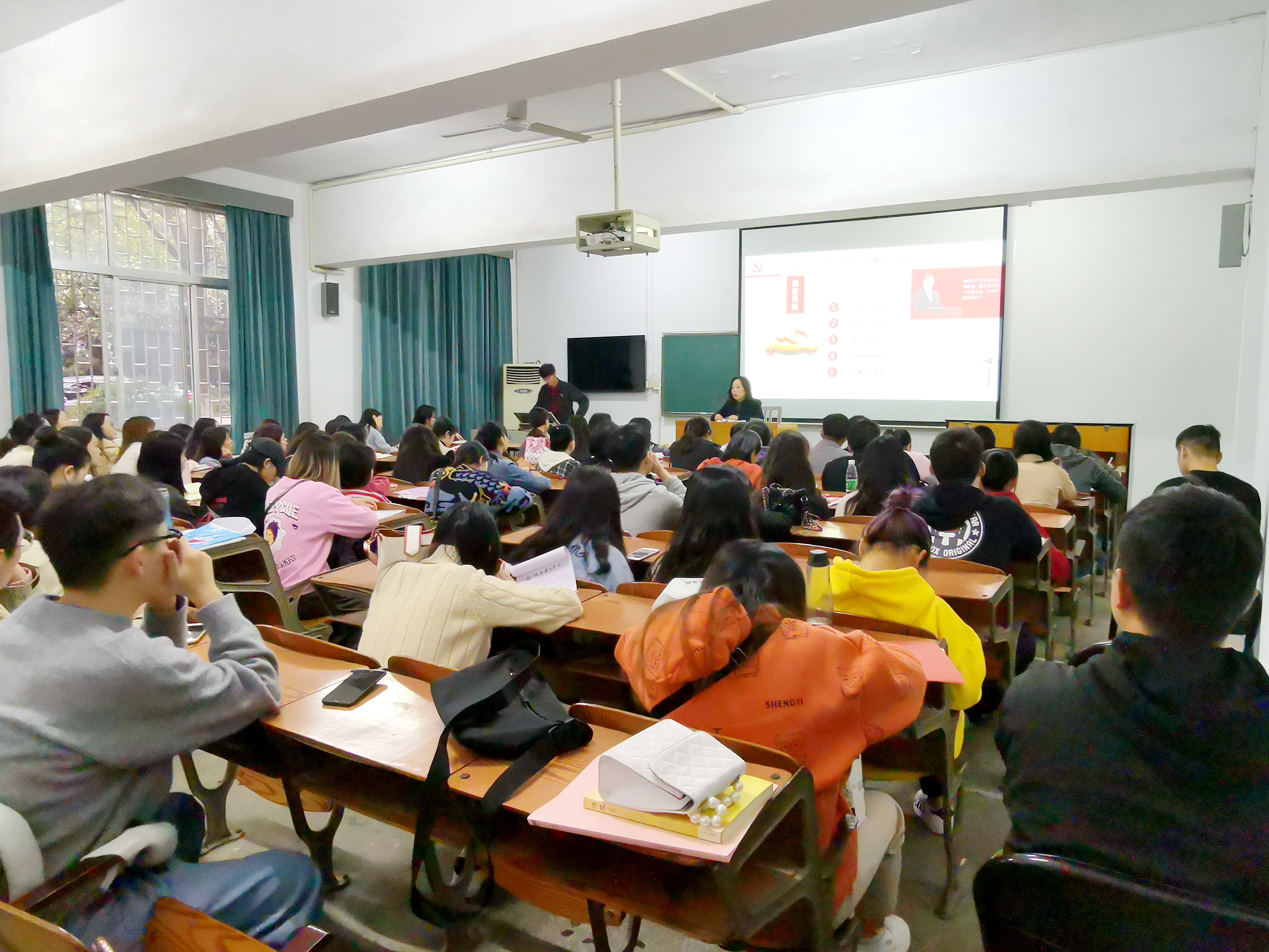 徐小立教授首先带领大家回溯历史,从争取民族独立、人民解放而冲锋陷阵、抛洒热血的战争年代,到保卫祖国,建设祖国而忘我劳动、艰苦创业的社会主义革命和建设时期,再到今天为实现“国家富强、民族振兴、人民幸福”的中国梦而开拓奋进、锐意创新的改革开放征程中,无数共产党员始终站在时代的最前列,责无旁贷地肩负起时代赋予的历史责任。接着,她从“重温党章要求”、“感受时代精神”、“汲取榜样力量”、“勇担责任使命”四个层面进行了生动的讲解,语言质朴,情真意切、引人入胜、观点十分接地气。