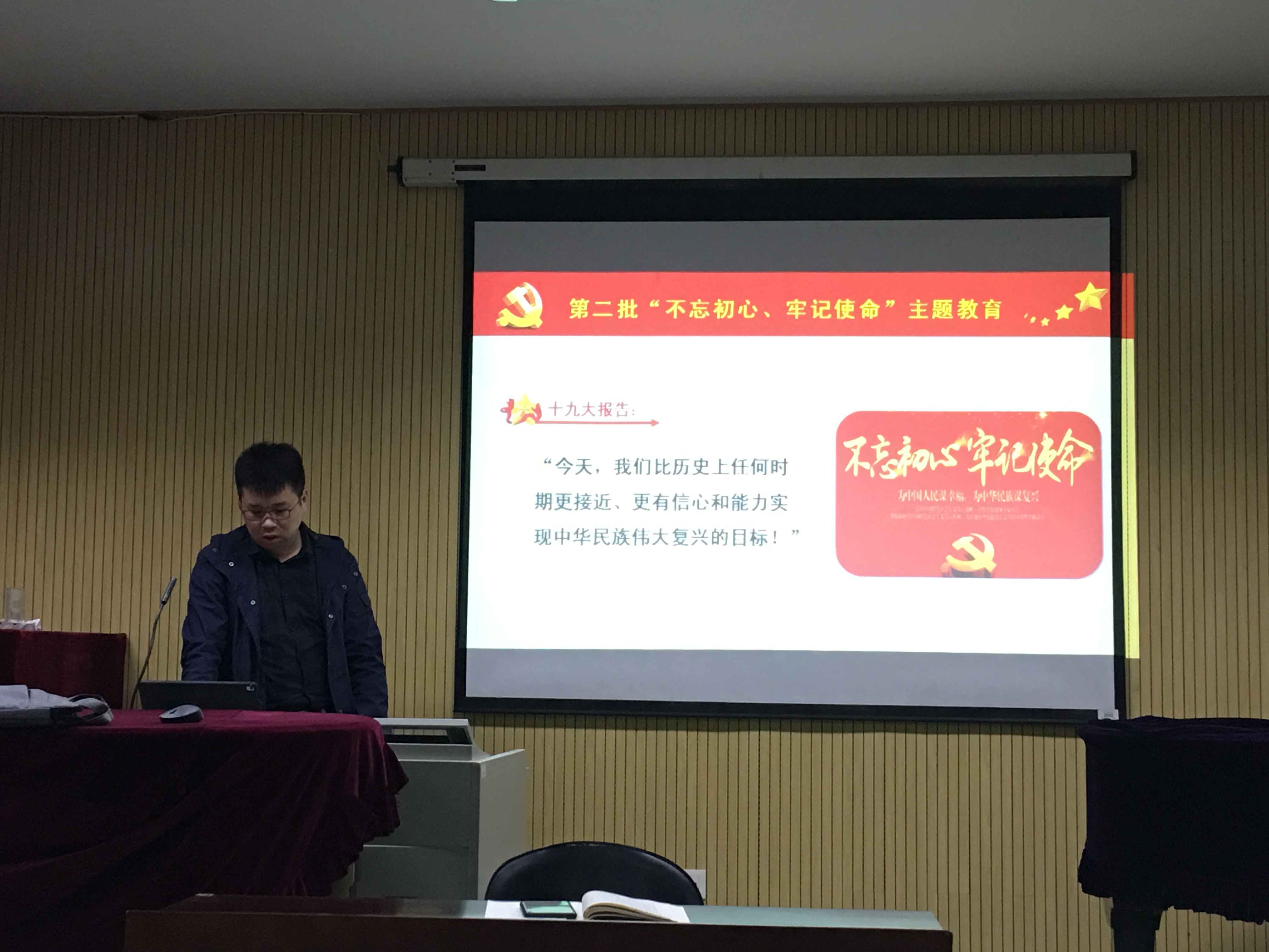 10月25日,MK体育教工二支部在欣赏室进行“不忘初心,牢记使命”主题教育专题党课活动,由支部书记刘长旭向支部党员讲授党课,主题是“永葆初心本色,牢记使命担当”。刘长旭以“什么是初心”、“为什么不忘初心”、“怎样不忘初心,牢记使命”这三个方面为主要内容,带领支部党员回顾党史国史,重温革命烈士遗言,温习入党誓词,谨记“为人民服务”的宗旨,时刻不忘自身作为一名中国共产党员的初心本心,牢记新时代我们的使命和担当。党课中,支部同志认真听讲,当听到李大钊、方志敏等革命先辈的壮烈遗言时,无不为之动容;当全体起立紧握右手,共同重温入党誓词时,每一名党员都是那么的动情专注。这节党课作为教工二支部“不忘初心、牢记使命”主题教育专题活动,使全体党员更加明确了自己作为一名共产党员,在习近平新时代中国特色社会主义理论指导下,如何脚踏实地,投身工作;如何坚持初心,勇于担当!
